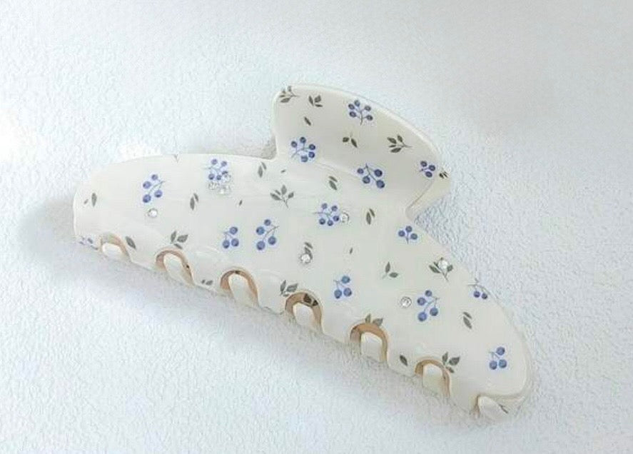 Bring breezy vibes to your hairstyle with this dreamy ivory claw clip, sprinkled with tiny blue blossoms and leafy details. A few sparkly rhinestones give it just the right amount of shimmer. It’s giving soft, sweet, and effortlessly cute—perfect for messy buns or polished updos alike.