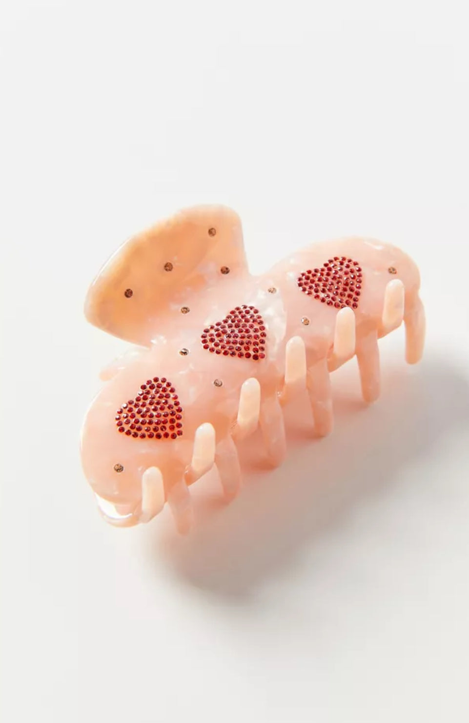 Add a touch of sparkle to your hairstyle with this adorable pink claw clip, featuring three red rhinestone hearts. Perfect for a sweet, romantic look or just to brighten up your everyday style!
